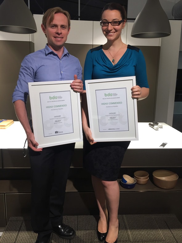 We also received two awards at the inaugural ACT Building Designer’s Awards in Canberra on Wednesday night. We received commendations in the ‘Sustainable/Solar Passive Design’ and the ‘Excellence in Project Documentation’ categories.